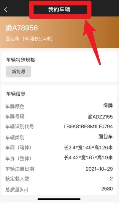 2. 完成登录操作后,点击“我的车辆”选项,便能查看当前已绑定车辆的各项详细信息,其中包括车牌号码、车辆类型以及注册日期等内容。