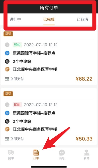 4. 轻点底部的“订单”标签,即可进入订单管理页面。在此页面,所有运输订单会按照“进行中”“已完成”“已取消”这几类进行分类展示,方便您浏览查看。