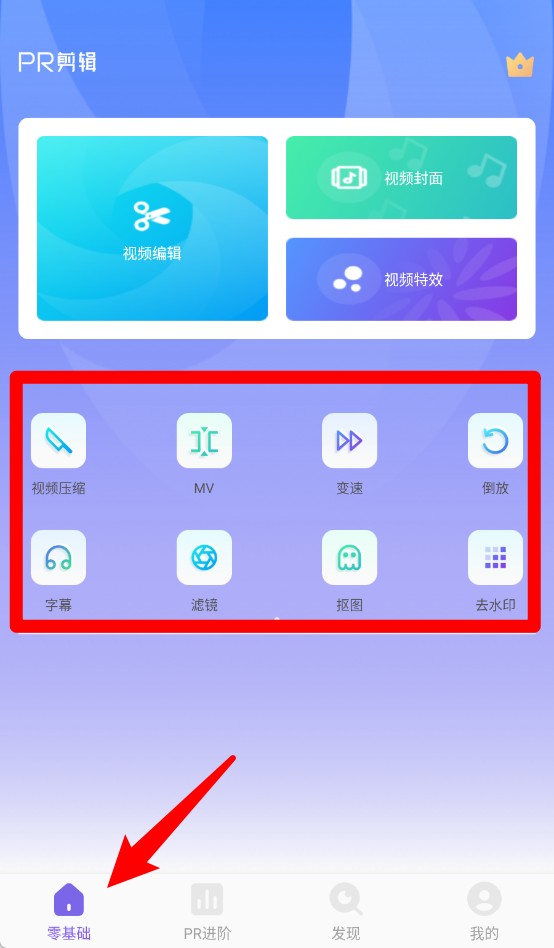 1、在“零基础”页面可使用视频压缩、加字幕、滤镜变速等功能,适合新手快速上手视频制作。
