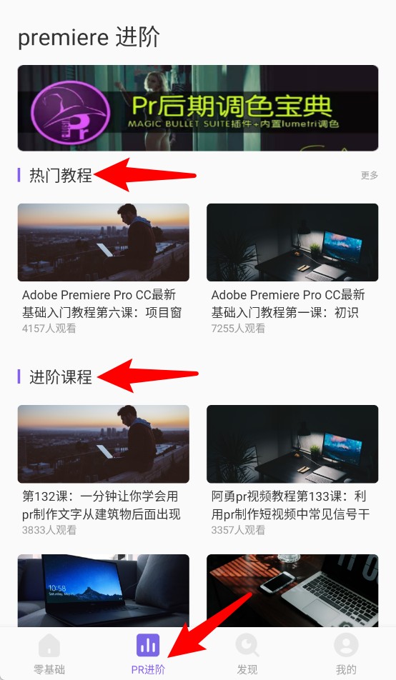 2、“PR进阶”模块提供丰富热门教程与进阶课程,覆盖PR软件各类常见实用技巧与项目实践。