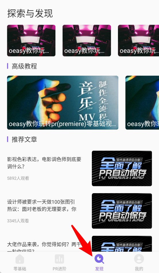3、“发现”页面汇聚高级教程和推荐文章,适合有一定基础用户探索更高阶的剪辑内容。