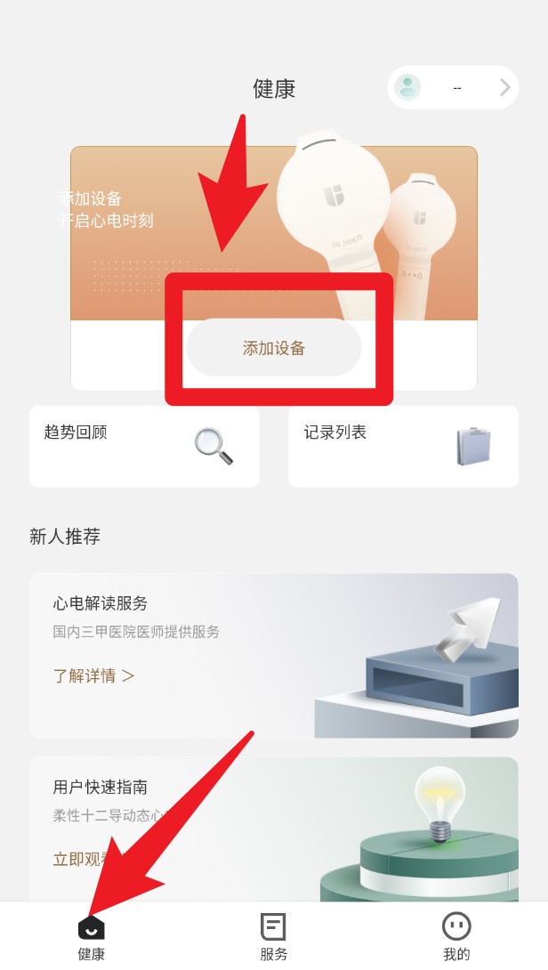 1. 打开App,点击底部的「健康」栏目,在首页选择「添加设备」按钮,按照引导连接心电贴等设备,随后便开始同步监测数据。