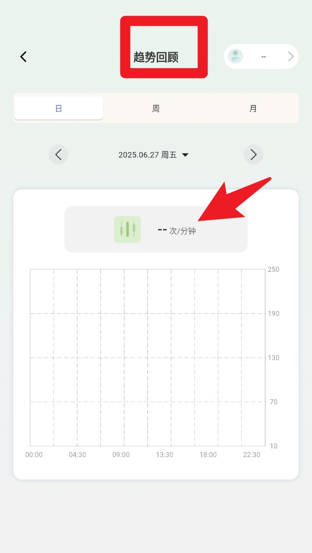 2. 当设备成功连接且完成数据记录后,点击「趋势回顾」,就能查看每日或每周的体征变化情况,数据趋势会以图表形式清晰呈现,每个时间段的情况一目了然。