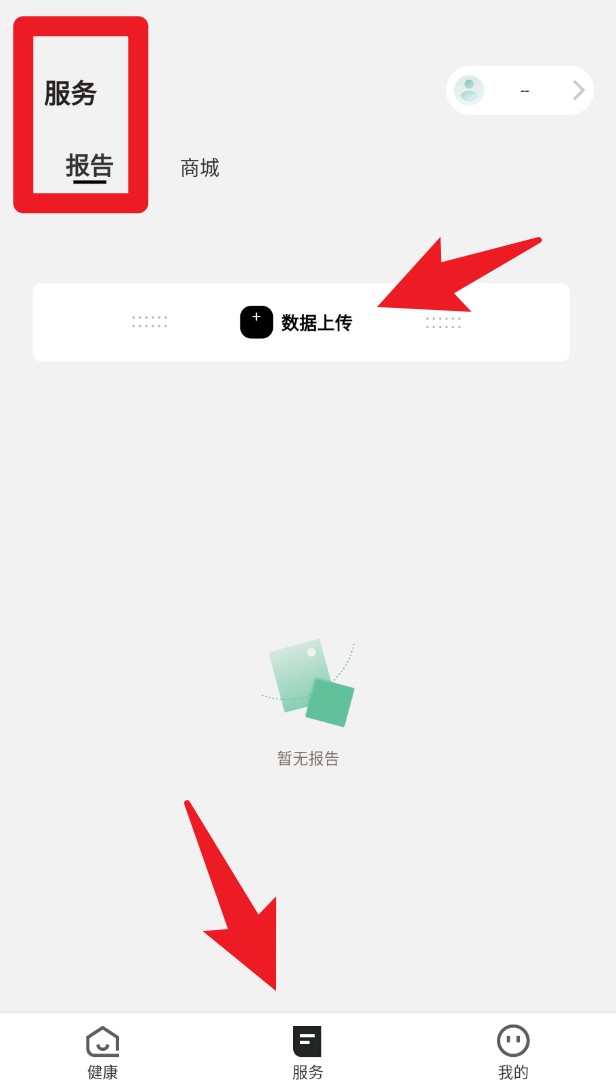 4. 切换到底部的「服务」栏目,进入「报告」页面,在此页面可上传检测数据。系统会生成完整体征分析报告,且支持对该报告进行查看与导出操作。