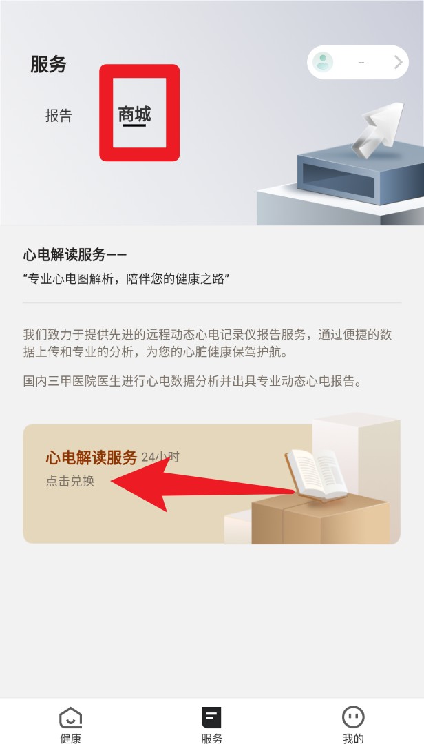 5. 在「商城」页面,您能够点击使用心电解读服务。该服务由三甲医院的专业医生针对您上传的数据出具解读结果,且支持您在24小时内随时申领。