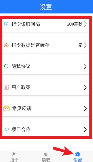3、于“设置”页面内,能够对指令读取间隔时间以及数据缓存选项进行设置,还能够查看协议与提交反馈。