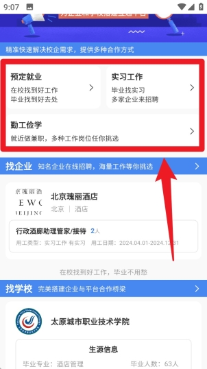 1. 打开首页后可在“预定就业”“实习工作”或“勤工俭学”模块中选择想要找的职位类型,点击即可进入对应职位列表查看。