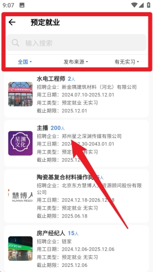 2. 在“预定就业”页面中可通过筛选条件快速查找岗位,也能直接输入关键词搜寻目标职位,再点选查看详情与人数需求。