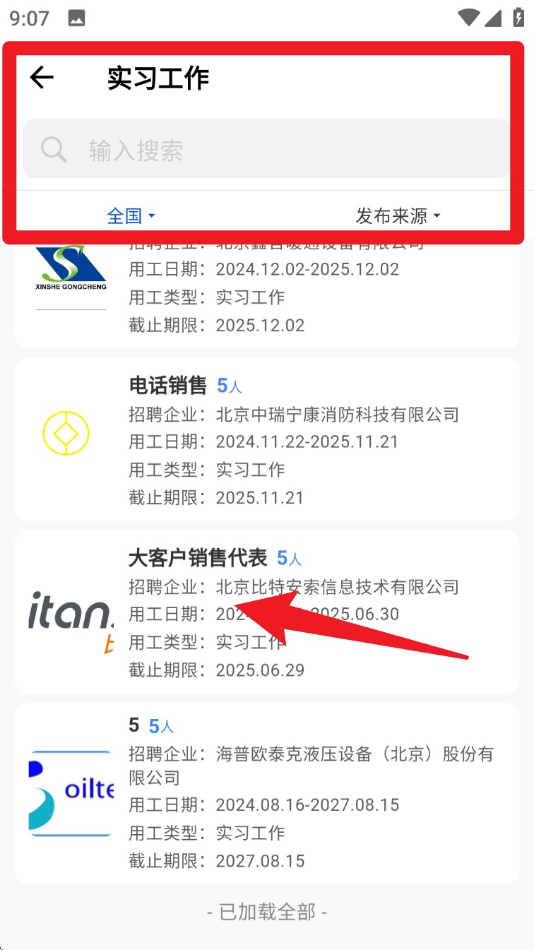 3. 若你想找实习,可在“实习工作”列表中挑选合适岗位,企业信息、用工时间与截止日期都清楚列出,一目了然。