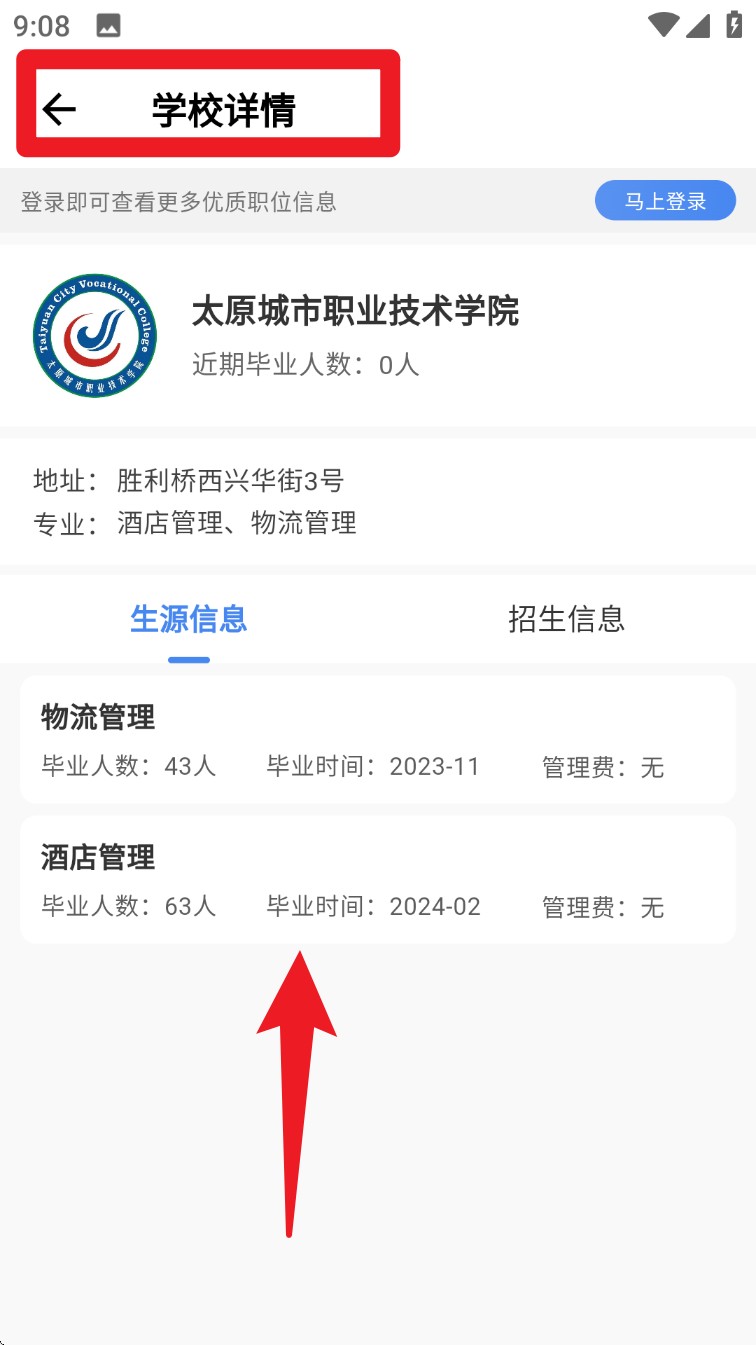 5. 若对学校资源有兴趣,进入“找学校”查看院校信息,点入某校还能看到生源专业、毕业人数与招生情况,数据完整透明。