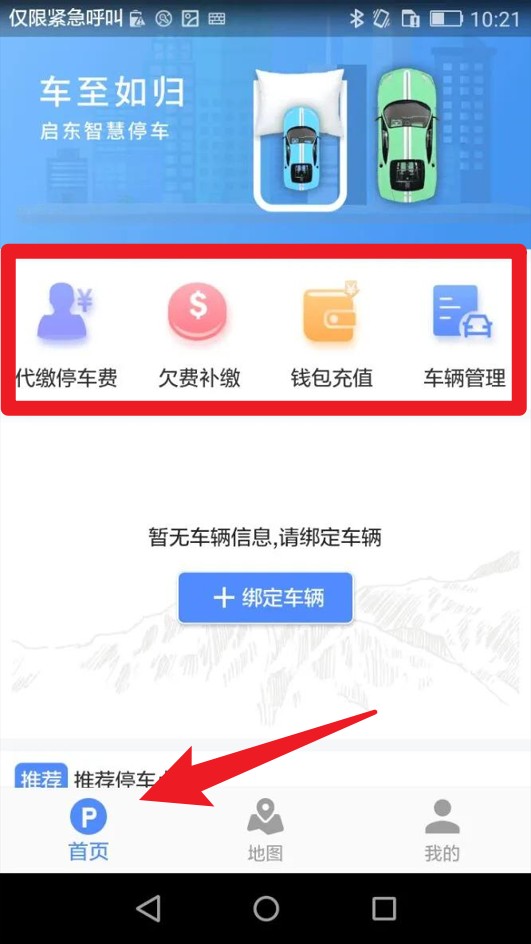 2、进入首页后,能看到代缴停车费、钱包储值、欠费补缴等功能。首次操作时,需关联车辆才能进行。