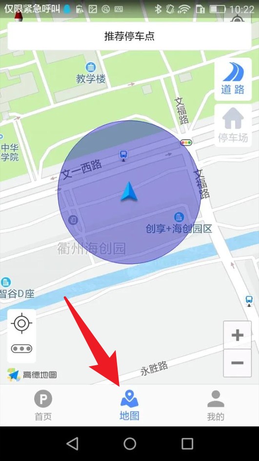 3、轻点底部的“地图”标签页,就能看到附近推荐的停车点,当前可用停车区域以蓝色圈标识。