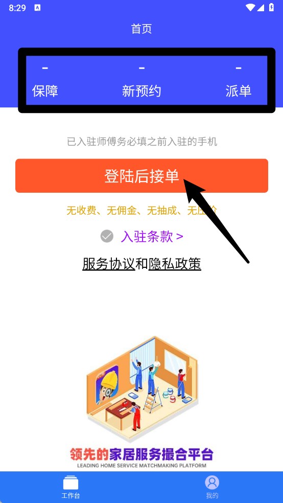 1. 在平台首页接单,需先进行登录操作。同时,平台支持实时查看保障服务、新预约情况以及派单数量。