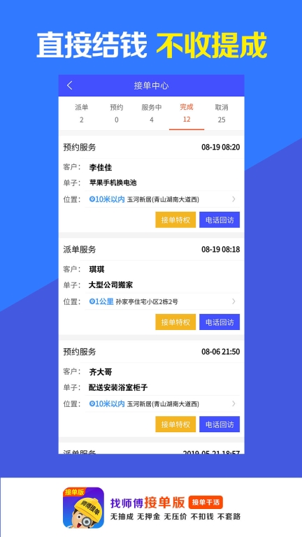 绝对免费,毫无套路,既无抽成,也无押金!客户直接付款,提供电话、抢单、预约、雇佣四种接单方式,让您接单毫无后顾之忧!