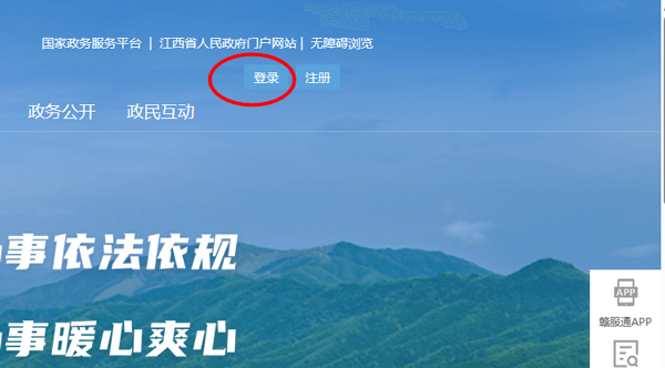 请在手机或电脑的浏览器里,打开此网址:http://www.jxzwfww.gov.cn 。网址成功打开后,在页面上点击【登录】按钮。
