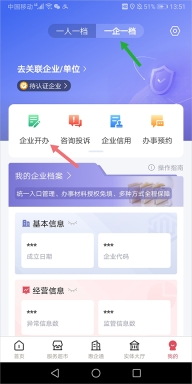 若企业尚未开通一网通办业务,可点击【企业开办】(如下图绿色箭头所指位置),先行开通“企业一网通办”;若企业已开通该业务,则可点击【电子营业执照领取】(如下图红色箭头所指位置) 。