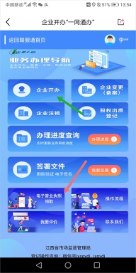 用户需先打开并登录江西政务服务网(也就是赣服通),完成实名认证后,进入【我的】页面。在此页面,点击底部导航栏中的【一企一档】(如以下绿色箭头所指位置),页面便会切换至企业服务专区。接着,在该专区页面点击【企业开办】。
