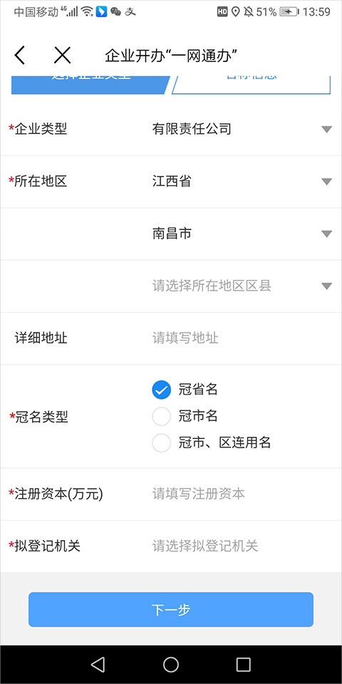 企业点击【企业开办】,填写并提交企业相关信息,提交后等待一个工作日便可获得批复。