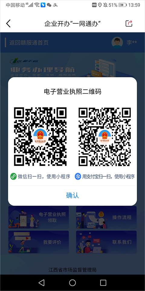 批复成功后,点击【电子营业执照领取】,随后用微信或支付宝扫码,进入【电子营业执照】平台,即可领取并使用电子营业执照。