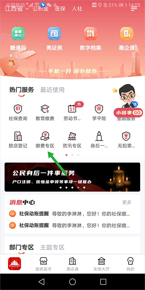 用户打开江西政务服务网(也就是赣服通)并完成登录,经过实名认证后,进入首页,点击【缴费专区】。