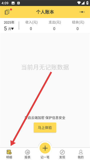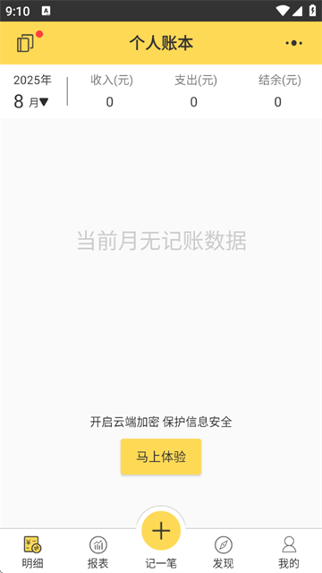 3、登录或进入后,进入个人账本界面,底部导航栏有明细、报表、记一笔、发现、我的等板块,方便进行账本个性化操作。