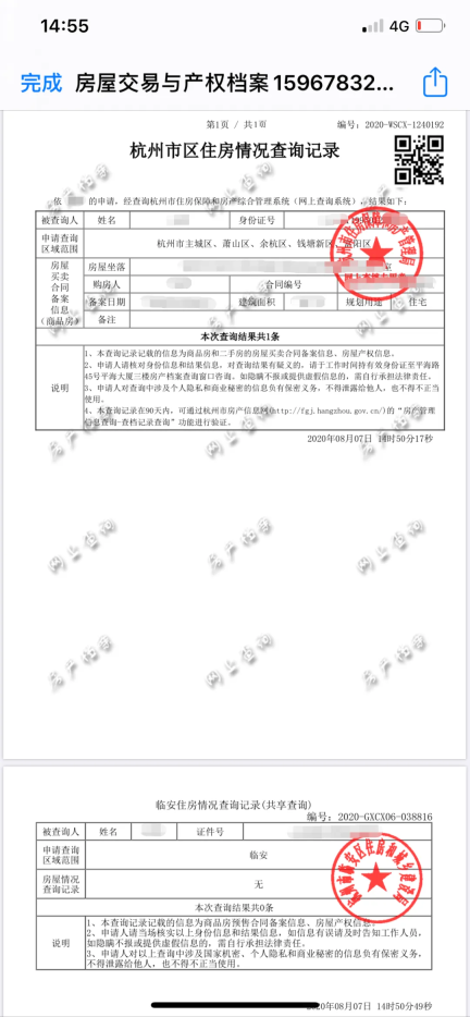 ④需点击右上方【】,后返回【我的-我的】中查看,即可获取个人杭州限购区及临安区住房情况查询记录(有红色电子章)。
