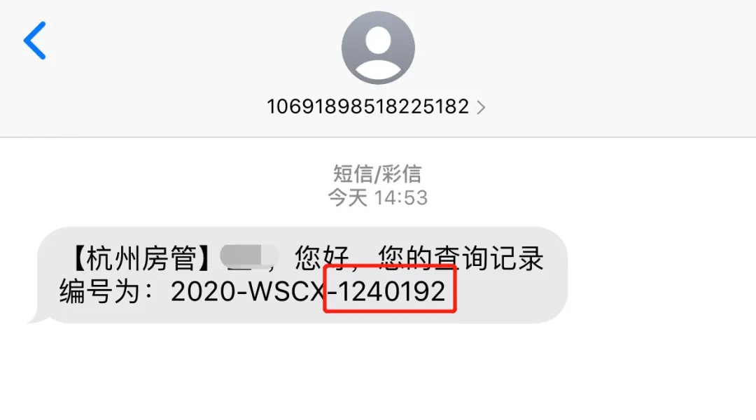 ③收到一条来自【杭州房管】的短信,短信内包含查询记录的编号,只需输入其后七位数字,点击提交,就能进入下一步。