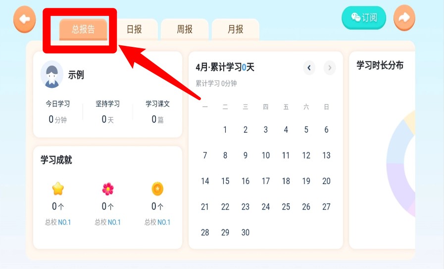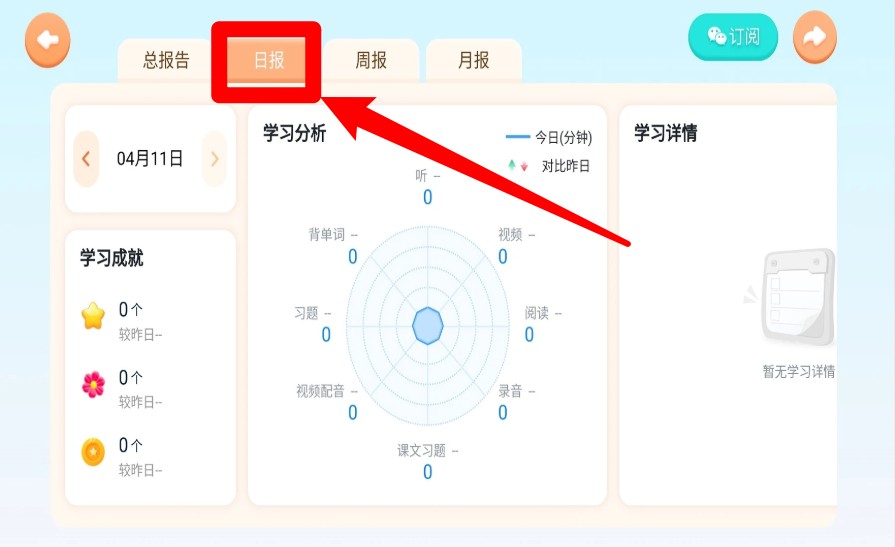 3、切换至“日报”标签页,查看当天的学习类型分布及详细学习分析图。