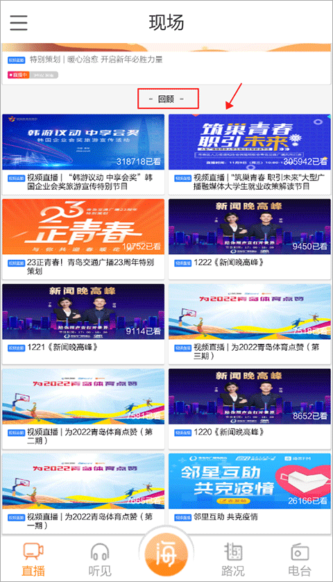 同样还是在【直播】界面,在直播的下方有一个“回顾”版块,所有直播的的节目回放都能在这里进行回看。