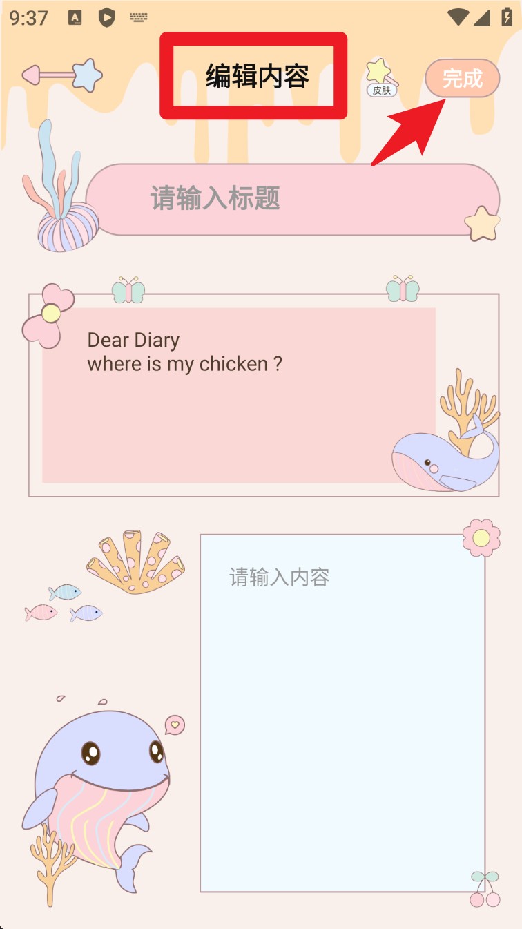 5. 在输入标题与内容之后,点击右上角的「完成」按钮,即可保存日记。此外,你还可以选用鲸鱼装饰贴纸,让页面显得更加可爱。