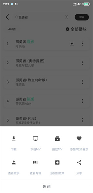 3、搜索完之后,点击歌曲右边三个点,就可以下载、播放、添加喜欢等操作;