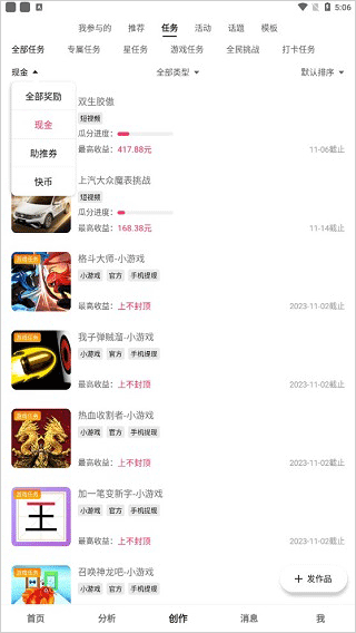 在快手创作者版App中,点击底部的“创作”按钮,你会看到各种任务、活动和话题。挑选相应的板块,并按照要求完成任务后就能获得奖励。