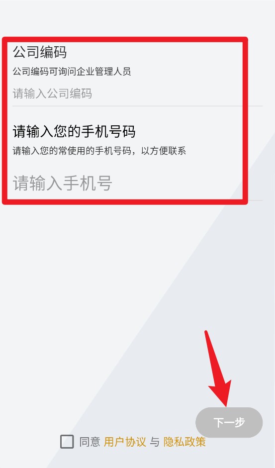 1. 首次进入时,需输入公司编码与手机号完成验证,在确认勾选下方的用户协议及隐私政策后,点击“下一步”以继续注册。