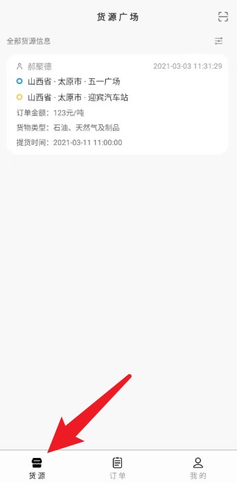 2. 轻点底部的“货源”选项,即可进入货源广场页面。在此页面,你能够浏览到最新的货源信息,还能查看货品类型、出发地、费用以及提货时间等详细内容。