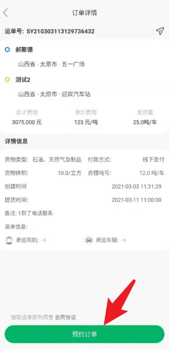 4、进入订单详情页面,即可查看运单编号、始发地、目的地以及费用结算方式等相关信息。在确认这些信息准确无误之后,点击“预约订单”,完成接单操作。