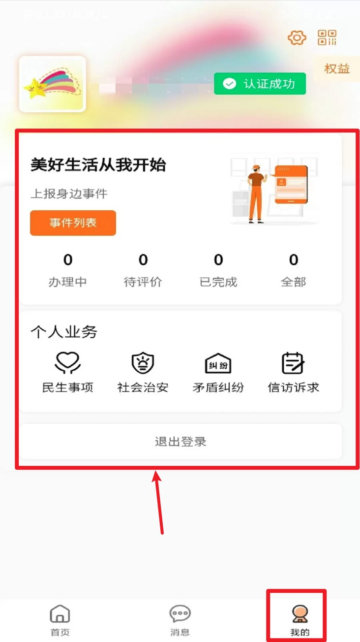 3. 若要查看上报进度或历史记录,点击右下角“我的”,进入个人中心后查看事件列表即可。