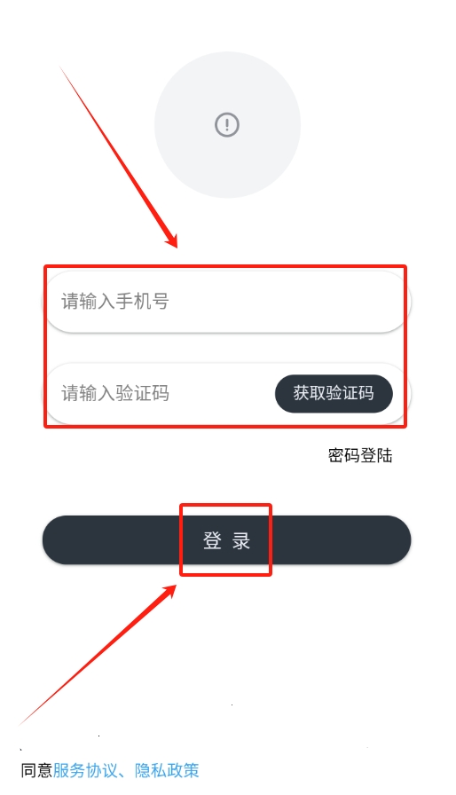 2、同意协议后进入软件,找到登录入口,填写手机号,收到验证码后填入验证码,完成登录。