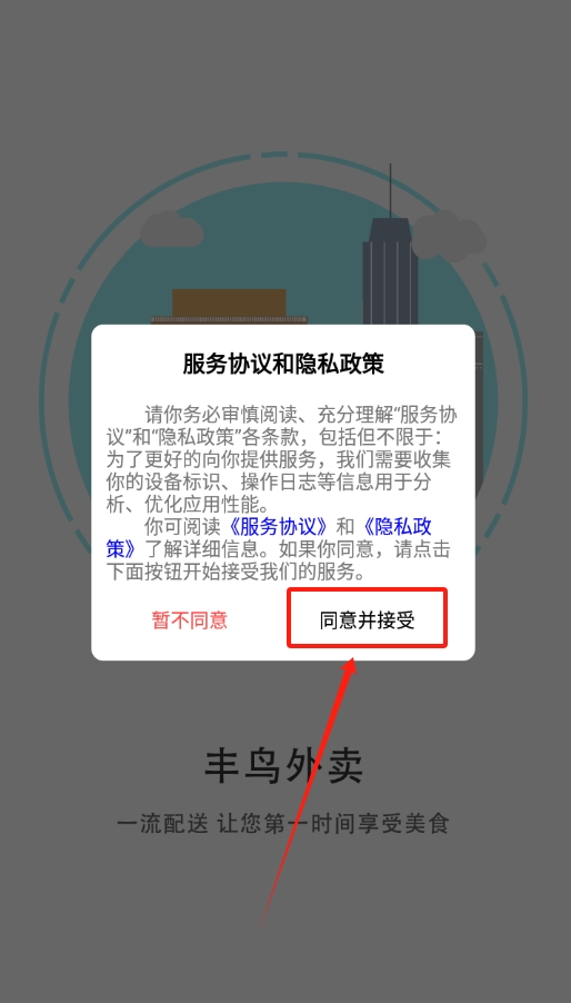 1. 打开丰鸟外卖,进入界面后,软件协议便映入眼帘。仔细阅读,确认无问题后,直接点击同意。
