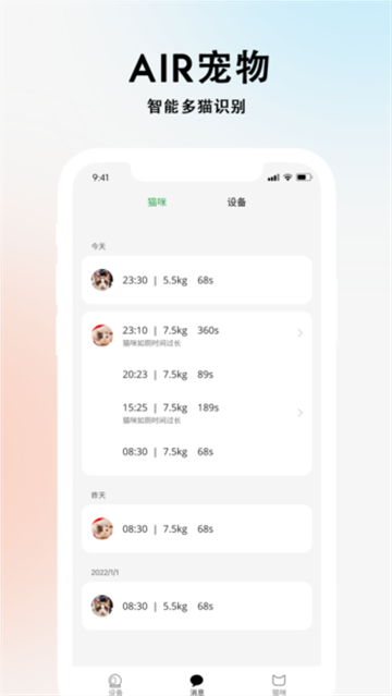 【健康数据管理】全方位实时监测猫咪体重与如厕时长,定期推送数据,并融合多猫识别技术,让猫咪如厕健康数据管理更为精准。只需打开 APP,就能即刻知晓猫咪的如厕健康情况。