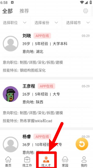 4. 进入“找人才”页面,通过选择省份和城市,对求职者资料进行筛选,以便更便捷地联系。