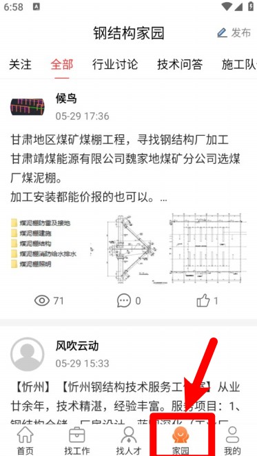 5. 轻点首页底部的“家园”图标,即可进入钢结构家园社区,知悉最新讨论内容。