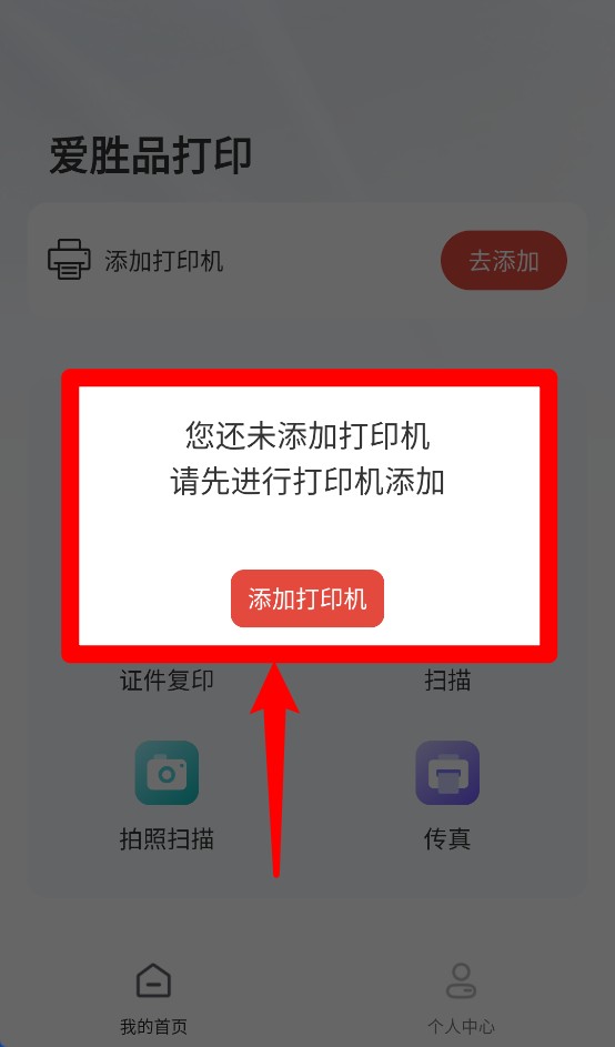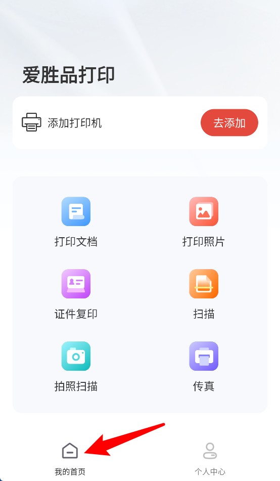 1. 轻点首页图标,即可进入打印主界面。在选择具体功能之前,务必先添加打印机设备。