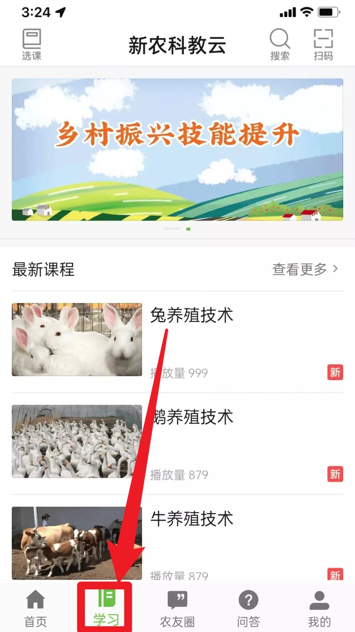 1. 点击底部菜单中的“学习”分页,可浏览养殖技术、种植方法等各类农业知识,支持分类筛选与收藏。