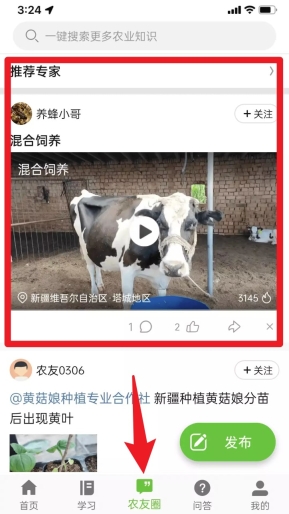 2. 进入“农友圈”版块,系统会推荐优质农业专家与活跃用户,便于查看他们的分享内容或关注互动。