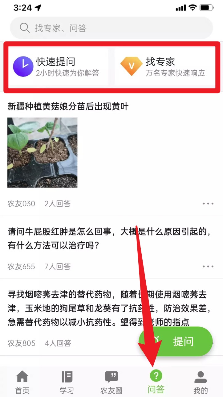 3. 在“问答”页面,能够快速发起提问,系统会智能匹配相关专家来进行解答,同时还能查看他人的提问及答案。