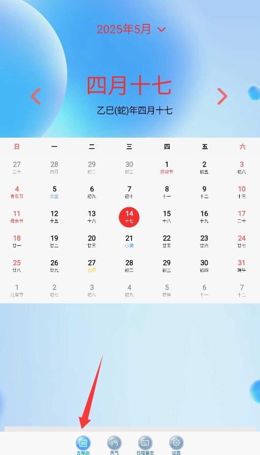 2、进入日历功能页面,在这里你能够查看完整的日期信息,其中对农历节气、节假日等特殊日期都有详细标注。
