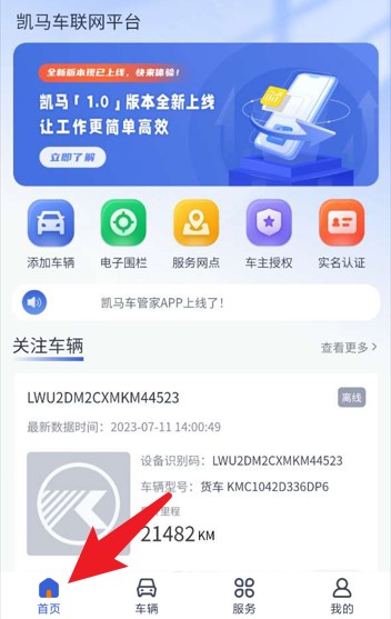 2. 在首页能够查看车辆总览、服务入口,以及关注车辆的实时里程数据和设备信息。