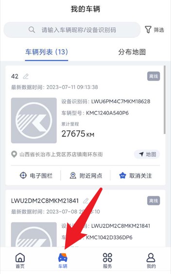 3、在“车辆”页面点击,就能对所有绑定车辆进行管理,还可查看车辆详情、位置以及运行状态等相关信息。