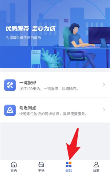 4、在“服务”页签,能一键快速报修,也可查找附近服务网点以获取支持。