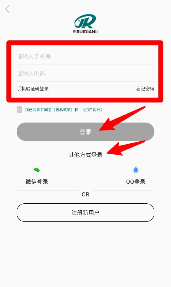 1. 开启亿瑞电力App,在登录界面输入手机号与密码进行登录,同时也支持通过验证码登录以及利用第三方账号快速登录。